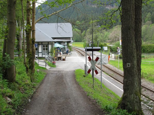 Bahn ist erneut auf dem Weg nach Cursdorf Rechtzeitig vor der Rückkehr des Zuges aus Lichtenhain ist der Haltepunkt erreicht und es lassen sich sogar noch einige Informationen zur Fröbelstadt Oberweißbach von den Info-Tafeln ziehen. Der Ort zieht sich über eine Länge von 2 Kilometern entlang des Weißbachtals hin, liegt zwischen 570 und 700 Metern hoch und verfügt über eine ausgeprägtes Wanderwegenetz. Ein Blick in Richtung des inzwischen vertrauten Geräusches und schon hat sich wieder eine schönes Bild ergeben. |