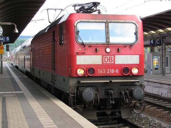 (143 218) Nach knapp 45 Minuten Aufenthalt ging es dann im Schlepp eines, wie schon geschrieben, verspäteten ICE aus München gemächlich Richtung Jena, die Gesamtfahrzeit ab Katzhütte betrug etwas mehr als 2,5 Stunden. |