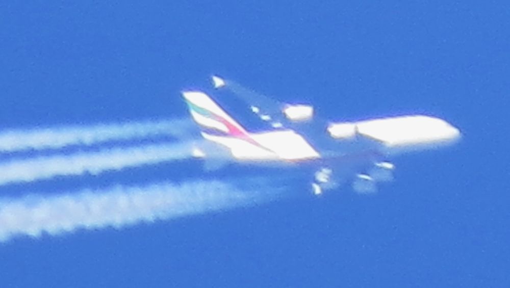 A6-EUP Emirates über Kleinlöbichau 2018 Die aktuelle Flughöhe betrug zu dieser Zeit auf dem Weg von Birmingham nach Dubai 39000 Fuss. |
