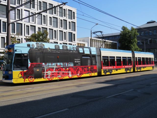 ![]() Nachdem ich im Herbst 2008 den Kessel der 99 2324 in Meiningen fotografiert hatte gelang es mir nun zwar nicht, die fertige Lok zu fotografieren, aber wenigstens reichte es für ein Foto ihrer grafischen Darstellung auf einer Rostocker Straßenbahn. |