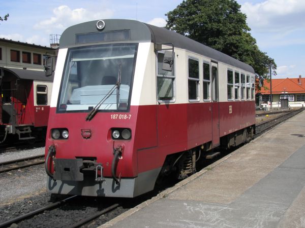 187 018 HSB Wernigerode 23.08.2009 Dieser Triebwagen wurde 1999 in Halberstadt gebaut und schafft mit seinen 345 PS eine Maximalgeschwindigkeit von 50 km/h. |