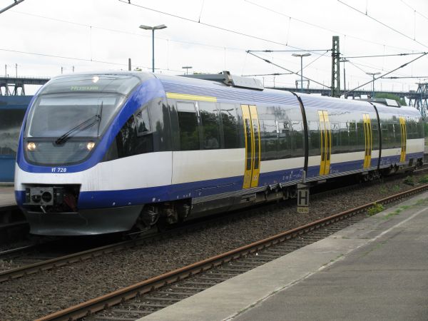 VT 728 Nord-Ostsee-Bahn Rendsburg 25.05.2008 Bisher fanden meine Begegnungen mit dieser Baureihe nur im Norden Deutschlands statt. Dieses im Jahr 2005 von Bombardier gebaute Fahrzeug ist hier im Bahnhof von Rendsburg auf dem Weg nach Husum. Im Hintergrund ist eben noch die Rampe zur Brücke zu erkennen. |