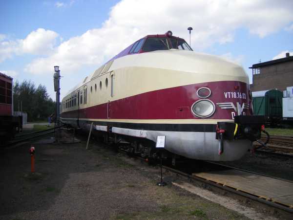 SVT 137 856 Bauart KÖLN DB Museum Halle/Saale 03.07.2010 Er wurde 1938 von Linke-Hofmann-Busch in Breslau gebaut. Ab 1945 USA 4 und 1956 als SVT 06 109 zur DB. 1958 wurde er bei der DR zum SVT 137 856, wo er am 03.03.1982 ausgemustert wurde. Seit 2000 bei Förderverein "Diesel-Schnelltriebwagen". |
