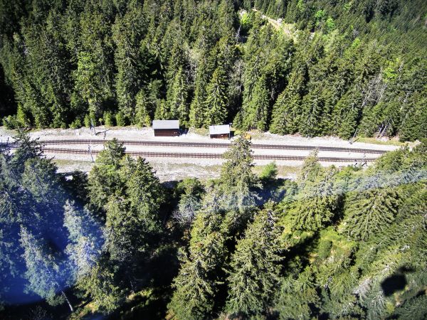 Die Rückfahrt in Richtung Eibsee ging dann mit der Seilbahn vonstatten. Während in der Bildmitte die letzte Station vor dem Tunnelportal, der Haltepunkt Riffelriß zu sehen ist, gibt der kleine Schatten in der rechten unteren Bildecke meinen Fotostandort an, die Seilbahngondel. |