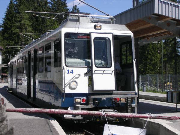 Nach einem kleinen Mittagsimbiss mit Ausflug zum Eibsee folgte der gemütliche Rückweg zur Station Eibsee, in der bereits Zug Nr.14 stand, allerdings nicht zur Fahrt in Richtung Garmisch-Partenkirchen. Er sollte eine Reisegruppe aufnehmen, die einige Zeit später mit dem Bus an der Station Eibsee anreiste und hinauf zum Zugspitzplatt bringen. |